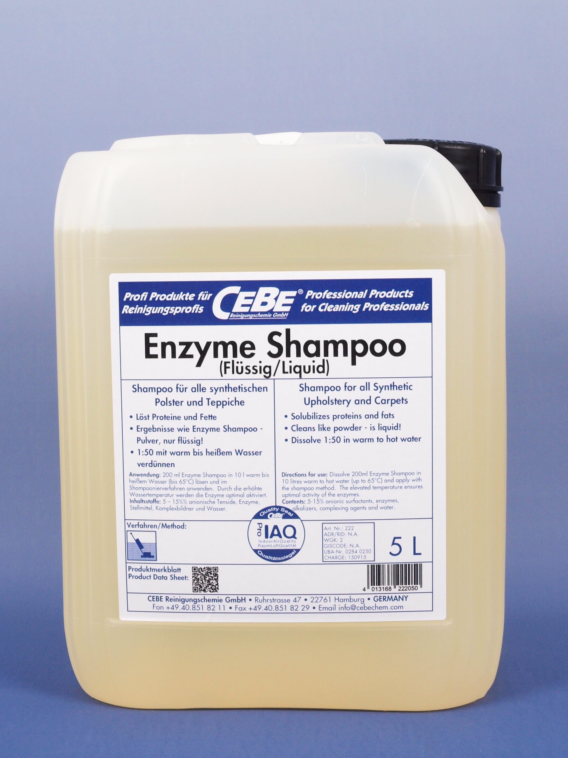 Produktinformation: Das Enzyme Shampoo in Flüssigform. Hat die gleichen Eigenschaften wie das Pulver, und zusätzlich die Vorteile des Flüssigkonzentrates. Das Produkt lässt sich auch in den Schaumgeneratoren in der Trockenschaum-Methode einsetzen. Es hat vielfältige Einsatzmöglichkeiten und zeichnet sich durch eine außergewöhnliche Reinigungsqualität aus. Der trockene Schaum absorbiert den Schmutz und ist nach dem Abtrocknen leicht absaugbar.