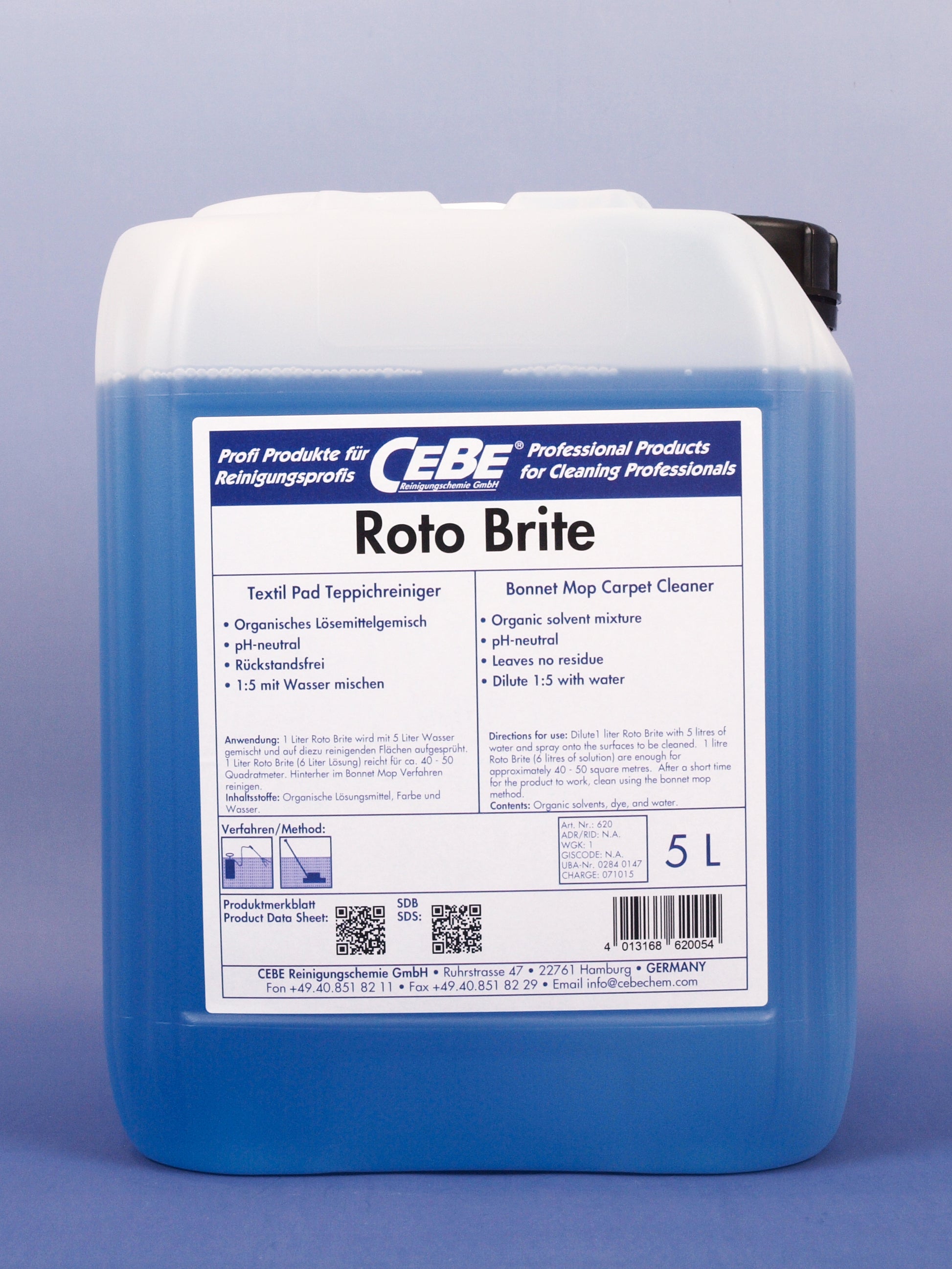 Verdünnung: 1:5 mit Wasser. Mit 6 Liter Lösung (1 Liter Roto Brite) können sie ca. 40 bis 50 qm Teppichboden reinigen.